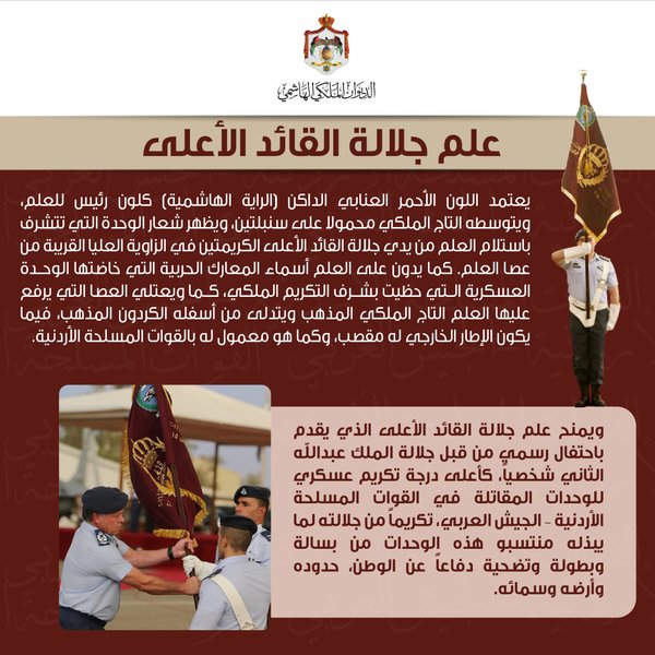 سلّم جلالة الملك عبدالله الثاني، القائد الأعلى للقوات المسلحة الأردنية - الجيش العربي، اليوم الأربعاء، علم جلالة القائد الأعلى لقيادة لواء حمزة بن عبد المطلب سيد الشهداء... |