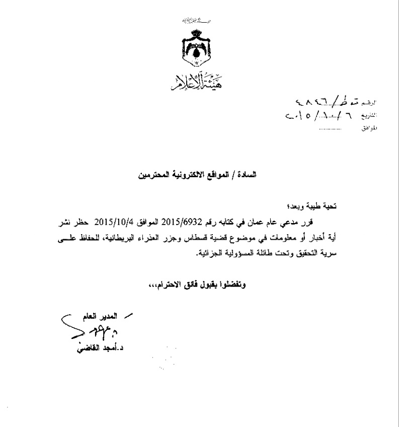 قرر مدعي عام عمان حظر النشر في القضية التي تعرف بقضية قسطاس وجزر العذراء البريطانية بحسب تعميم هيئة الإعلام المرئي والمسموع والذي وصل أحداث اليوم نسخة منه .و جاء في... |