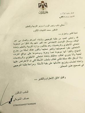وجه النائب عساف الشوبكي الاثنين رسالة لوزير التربية يسأل فيها عن امتحاني الانجليزي والرياضيات لطلبة التوجيهي .وتاليا نص السؤال :معالي نائب رئيس الوزراء وزير التربية... |
