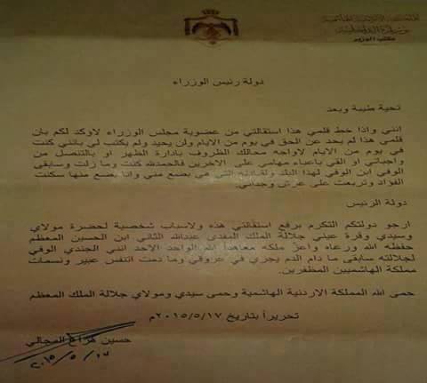 تداول ناشطون عبر وسائل التواصل الاجتماعي صورة الكتاب الذي تقدم به وزير الداخلية حسين هزاع المجالي في استقالته والتي رفعها الى رئيس الحكومة ، وقال فيها انه لم يدر ظهره يوما... |