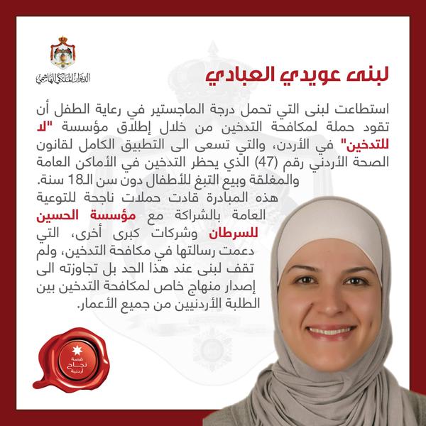| "لبنى العبادي" حاربت التدخين فحظيت بتكريم الملك |
