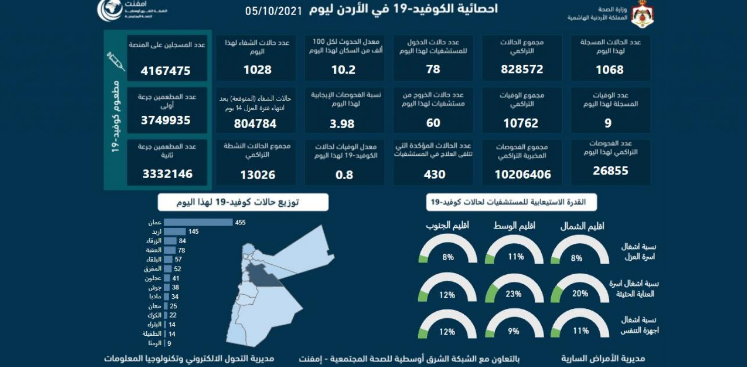 | 9 وفيات و1068 إصابة جديدة بكورونا في الأردن |
