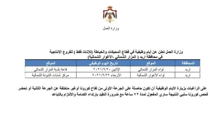 أعلنت وزارة العمل، الأحد، عن أيام وظيفية في قطاع المحيكات والخياطة (للإناث فقط ) للفروع الإنتاجية في محافظة اربد( المزار الشمالي، الأغوار الشمالية).وقالت الوزارة، إنه على... |