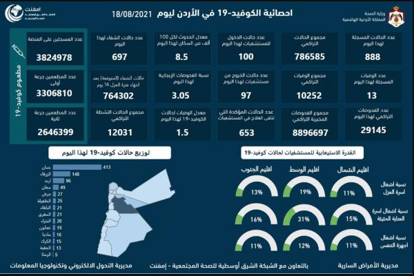 | 13 وفاة و888 اصابة كورونا جديدة في الأردن |