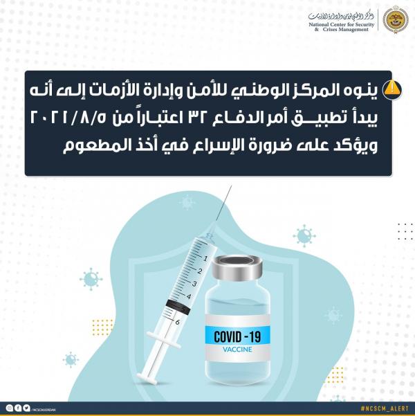 ذكر المركز الوطني للأمن وإدارة الازمات الأردنيين بأن تطبيق أمر الدفاع 32 والذي يفرض اجراءات على عدم متلقي لقاح كورونا، يبدأ يوم 5-8-2021، داعيا الى الاسراع بتلقي... |