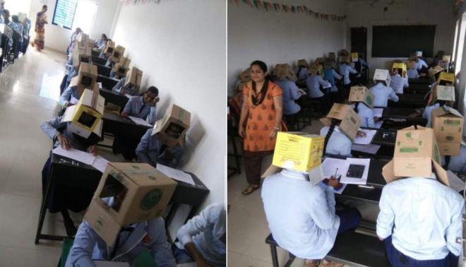 | مدرسة هندية تكافح الغش بصناديق على رؤوس الطلاب |