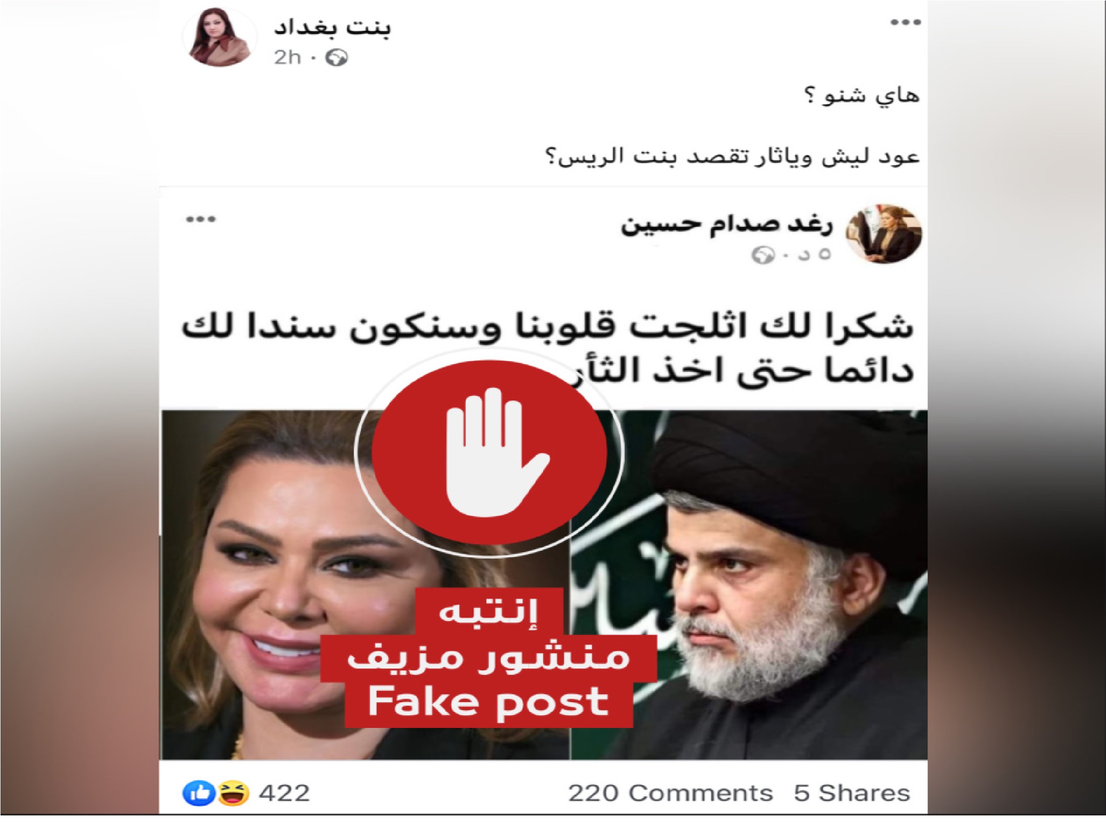 نشرت بعض صفحات عبر مواقع التواصل الاجتماعي صورة لقطة شاشة لمنشور على حساب باسم رغد صدام حسين يتضمن صورة لها ولمقتدى الصدر مرفق بعبارة شكرا لك اثلجت قلوبنا وسنكون سندا لك... |