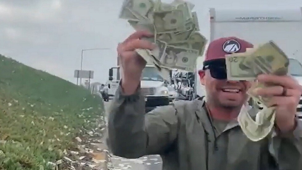 | آلاف الدولارات تسقط من شاحنة وتتناثر موقفة الحركة على طريق كاليفورنيا |