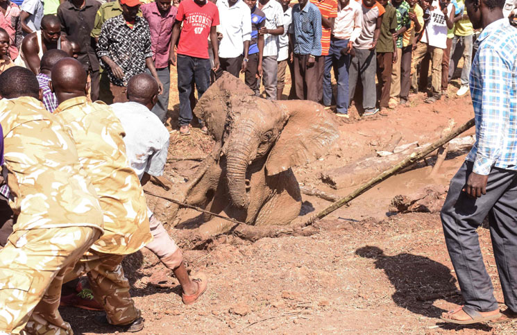 انقاذ ثلاثة فيلة عالقة في طين عميق على شواطئ بحيرة كابناروك الموسمية، التي تقع عند قاعدة وادي كيريو، وهي جزء من النظام الإيكولوجي لوادي كينيا المتصدع في مقاطعة بارينغو |