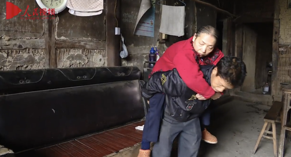 | رجل صيني يحمل أمه المشلولة لمدة 15 عاماً |