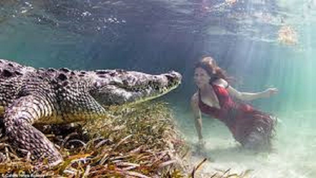 | بالصور .. عارضة ازياء تغامر بحياتها مع تمساح |