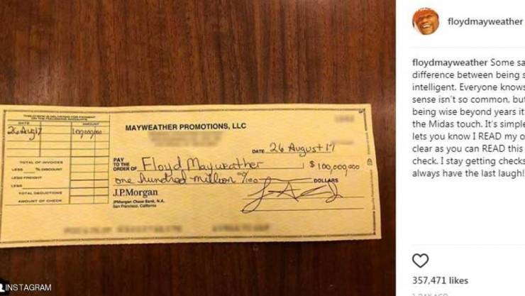 أثار الملاكم الأميركي فلويد مايويذر دهشة جمهوره مجددا، بنشره صورة تثبت ثروته الفاحشة، على حسابه الشخصي بموقع إنستغرام.ونشر مايويذر صورة شيك بقيمة 100 مليون دولار، لم يتم... |