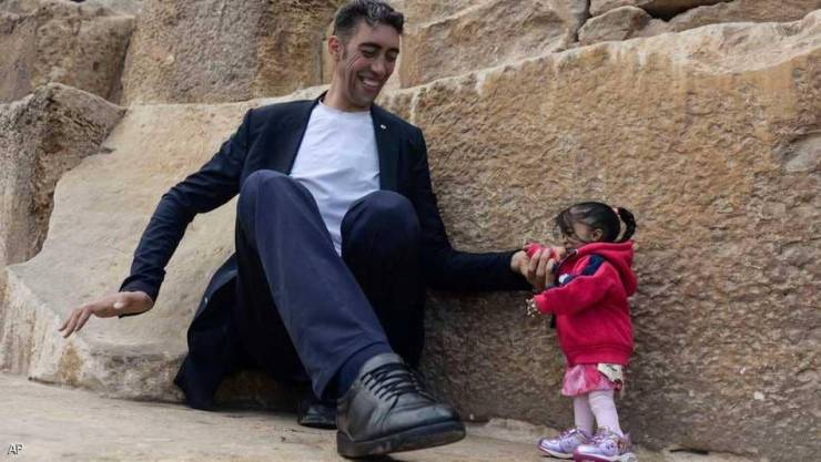 | أطول رجل وأقصر امرأة تحت سفح الأهرامات |