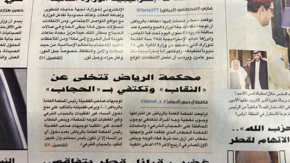 | محكمة الرياض تتراجع عن شرط غطاء الوجه وتكتفي بـالحجاب |