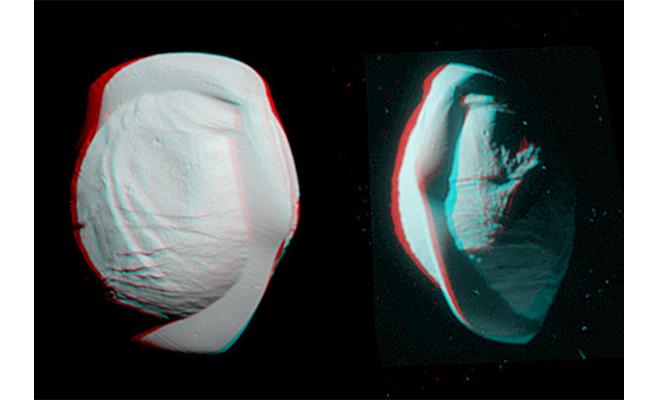 عرضت ناسا صورة ثلاثية الأبعاد لقمر زحل بان ذو الشكل المميز، حيث يشبه القمر بشكله فطيرة فضائية.وتظهر الصورة بوضوح النصفين الشمالي والجنوبي للقمر بان، والذي يسمى أيضا زحل... |