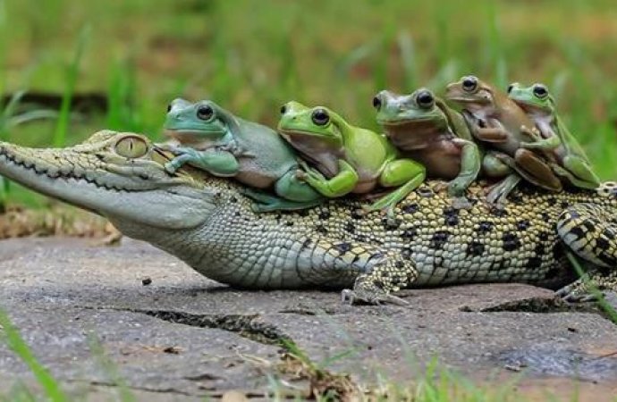 | تمساح يسمح لضفادع بتوصيلة مجانية |
