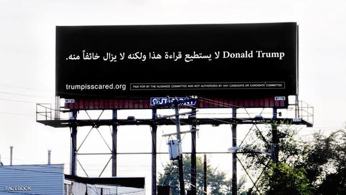 | لافتة بالعربية تسخر من ترامب بأمريكا |