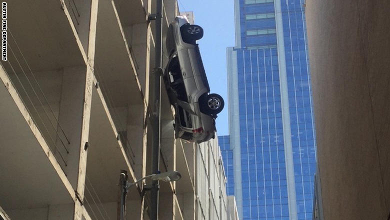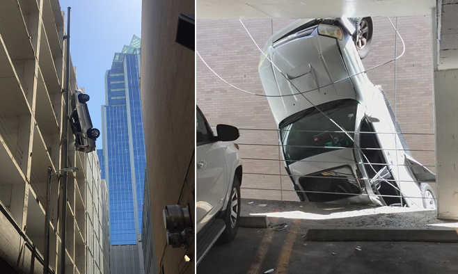 | سيارة تتدلى من الطابق التاسع .. ماذا حل بالسائق وسيارته |