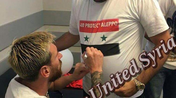 عبارة ألله يحمي حلب التي كتبت على قميص أحد معجبي لاعب كرة القدم الشهير ميسي دفعت بالأخير لإعلان تضامنه مع المدينة وأهلها وما يجري فيها من قتل ممنهج على يد جيش الأسد، من... |