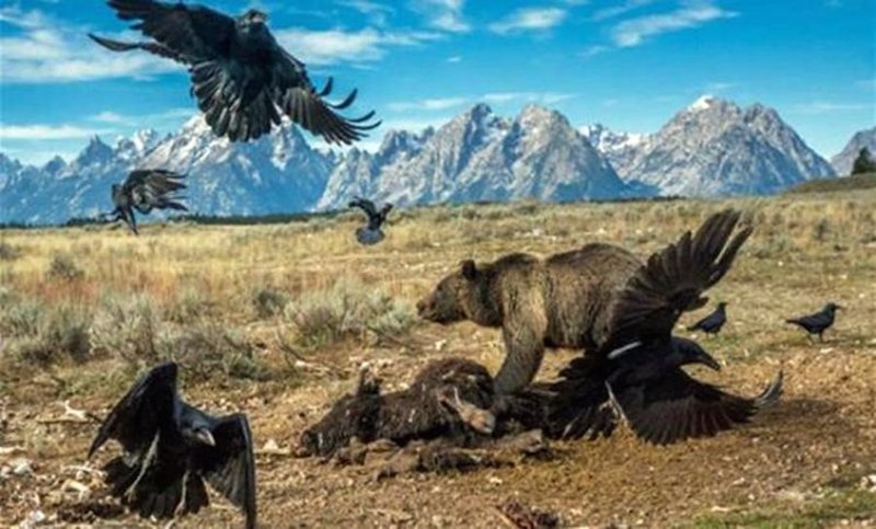 قضى مصور محترف 5 أشهر، التقط خلالها 200 ألف صورة ليحصل على الأفضل بينها، لمشهد مطاردة بين الدب الأشيب والغربان وخلفها منظر الجبال، داخل منتزه غراند تيتون الوطني بالولايات... |