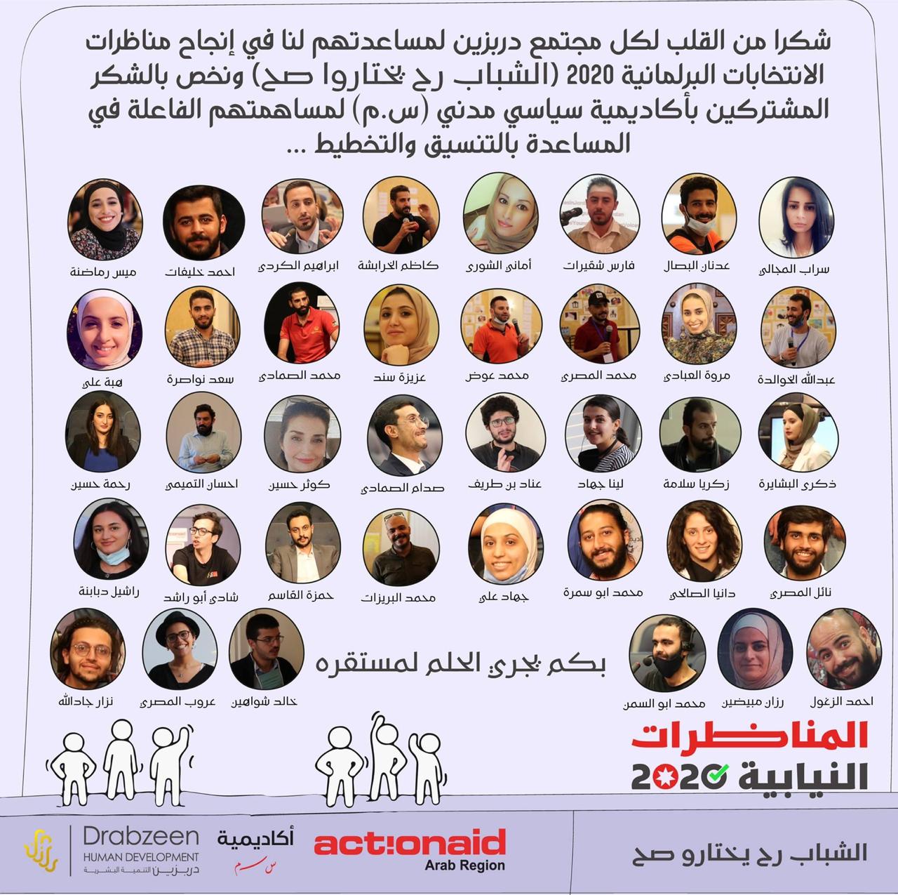 عقدت مؤسسة دربزين التنمية البشرية بالشراكة مع منظمة أكشن إيد المنطقة العربية ستة مناظرات بين مترشحين للمجلس النيابي التاسع عشر من مختلف المحافظات والدوائر الانتخابية تحت... |