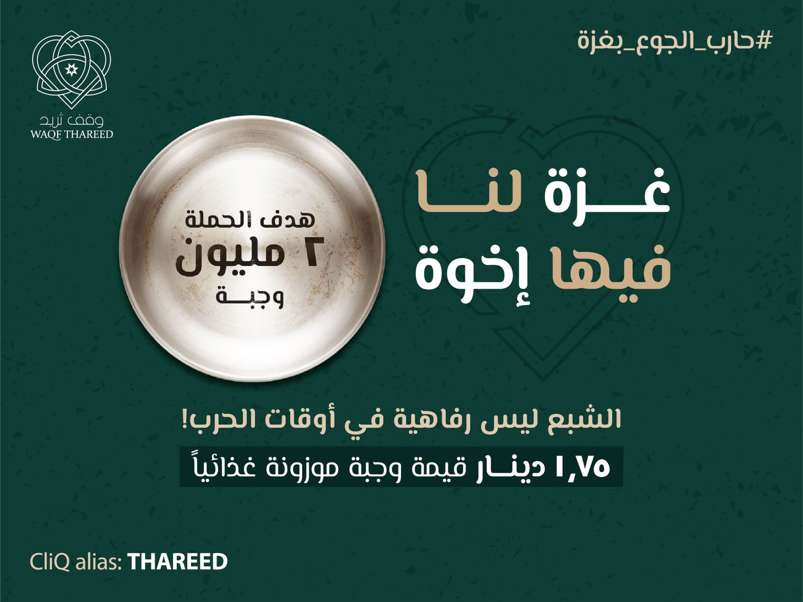 | وقف ثريد يطلق الحملة الإغاثية "غزة لنا فيها أخوة" لتقديم 2 مليون وجبة لأهلنا في غزة |