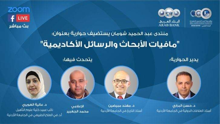يعقد منتدى عبد الحميد شومان، عند السادسة والنصف من مساء يوم غد الإثنين 6 تموز حوارية مافيات الأبحاث والرسائل الأكاديمية، على منصة زووم، وعلى صفحة المؤسسة على فيسبوك.يشارك... |