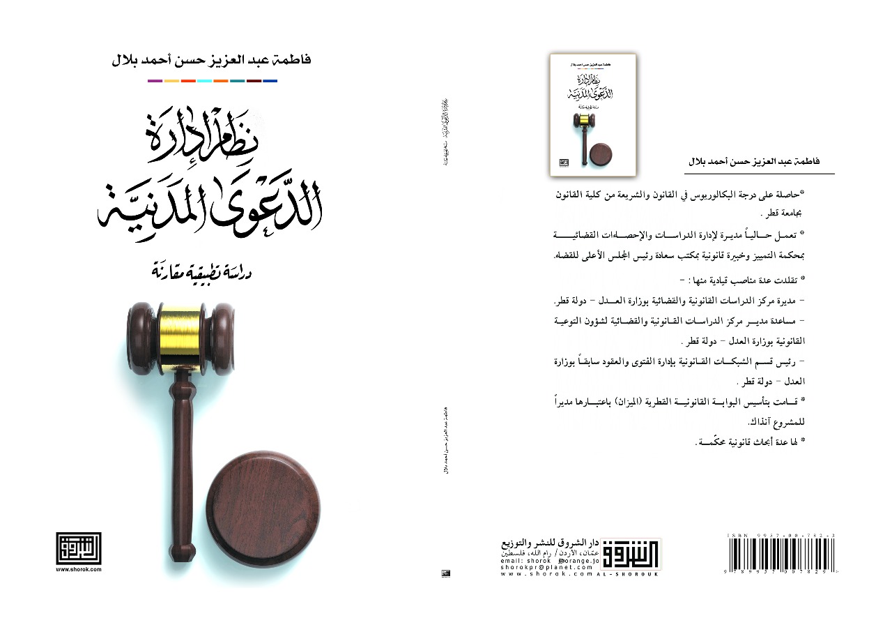 صدر عن دار الشروق للنشر والتوزيع عمان، الأردن، فلسطين. كتاب بعنوان نظام إدارة الدعوى المدنية- دراسة تطبيقية مقارنةّ، لمديرة إدارة الدراسات والإحصاءات القضائية بدولة قطر،... |