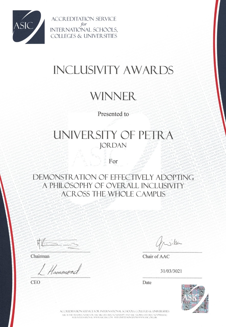 | هيئة الاعتماد البريطانية تمنح جامعة البترا جائزة "آسِك "2021 في الشمولية |