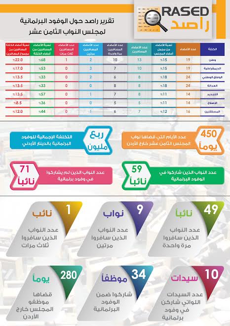 450 يوماً مجموع الأيام التي قضاها 59 نائباً خارج الأردن بكلفة زادت عن ربع مليون دينار. أكثر من ربع مليون دينار تكلفة وفود نيابية خلال 145 يوماً. في سياق مراقبة برنامج راصد... |
