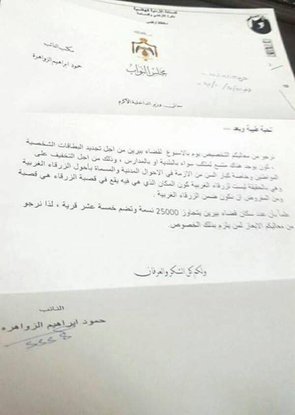 طالب النائب حمود الزواهرة وزارة الداخلية بالتسهيل على االمواطنين في قضاء بيرين لاستبدال بطاقات الاحوال المدنية .وبعث النائب الزواهرة مذكرة الى وزير الداخلية، طالب فيها... |