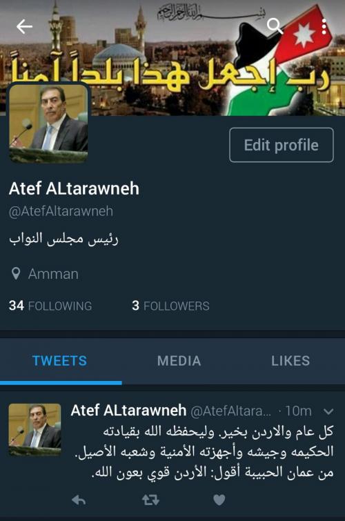 أطلق رئيس مجلس النواب النائب عاطف الطراونه حسابه الشخصي على موقع التواصل الاجتماعي توتير.وكانت اول تغريده يدشن بها على حسابه 'كل عام والاردن بخير. وليحفظه الله بقيادته... |