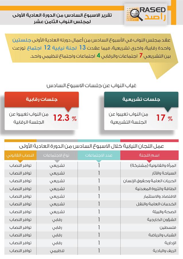 ·17% من النواب يتغيبون عن الجلسة التشريعية و 12.3% يتغيبون عن الرقابية.13 اجتماع للجان منهم 4 اجتماعات رقابية والانتهاء من ال الموازنة نهاية الشهر الجاري. نواب يخالفون... |