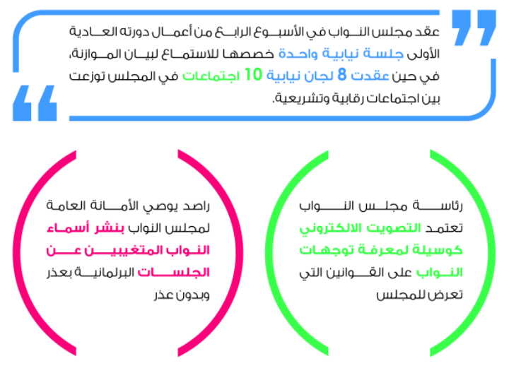 * راصد يوصي بنشر أسماء الحضور والغياب * راصد يثني على قرار رئاسة المجلس باعتماد التصويت الالكتروني* 8 لجان نيابية تعقد 10 اجتماعات خلال الاسبوع الرابععقد مجلس النواب في... |