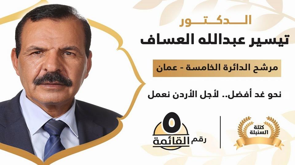 مرشح قائمة السنبلةالدكتور تيسير عبدالله مكيد العساف بفخر واعتزاز بكم ابناء الدائرة الخامسة - عمان اتشرف بدعوتكم لحضور افتتاح المقر الانتخابي الكائن في منطقة تلاع العلي... |