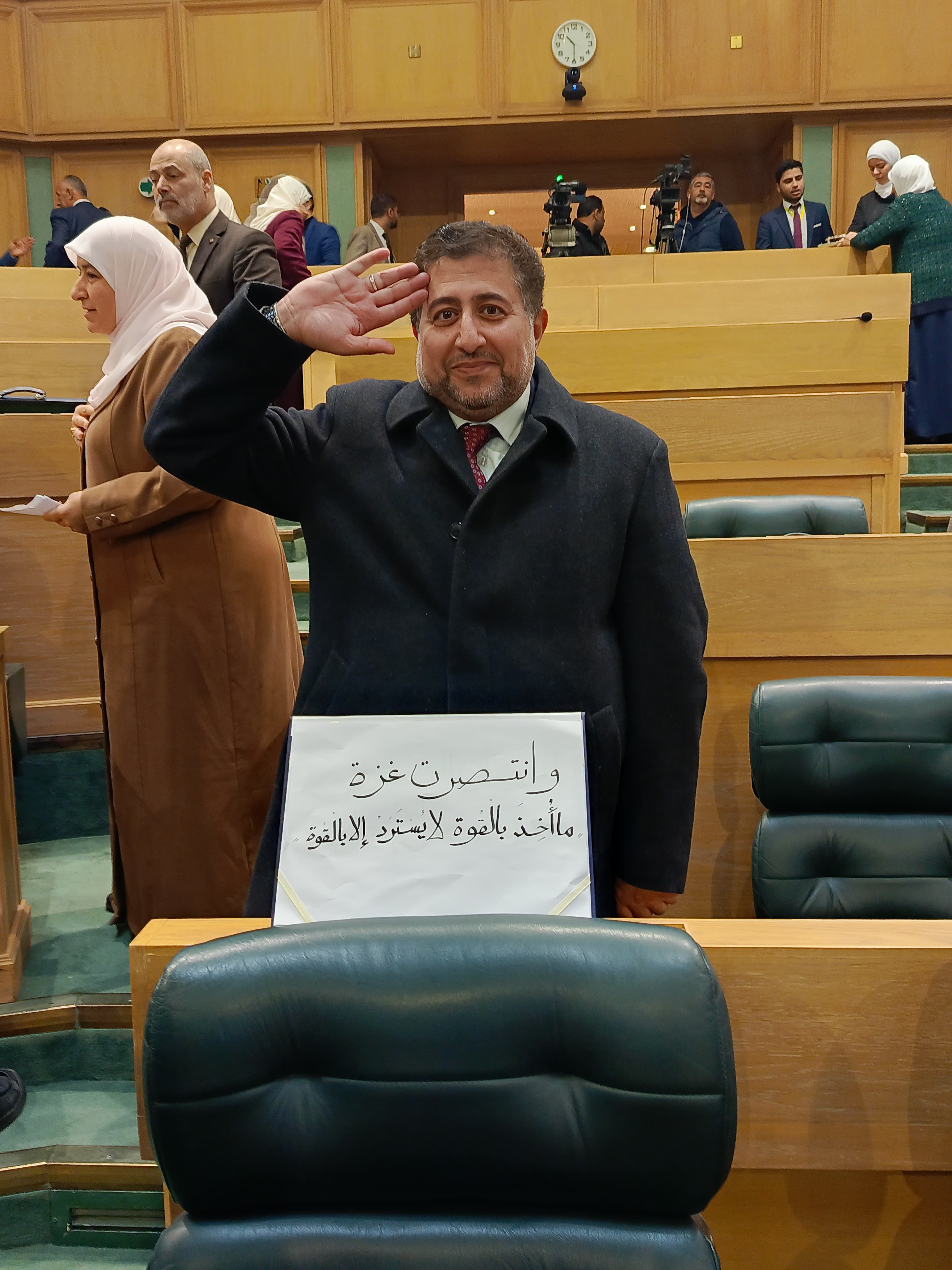 | النائب الرقب يوجه تحية عسكرية داخل مجلس النواب بمناسبة انتهاء الحرب على غزة |