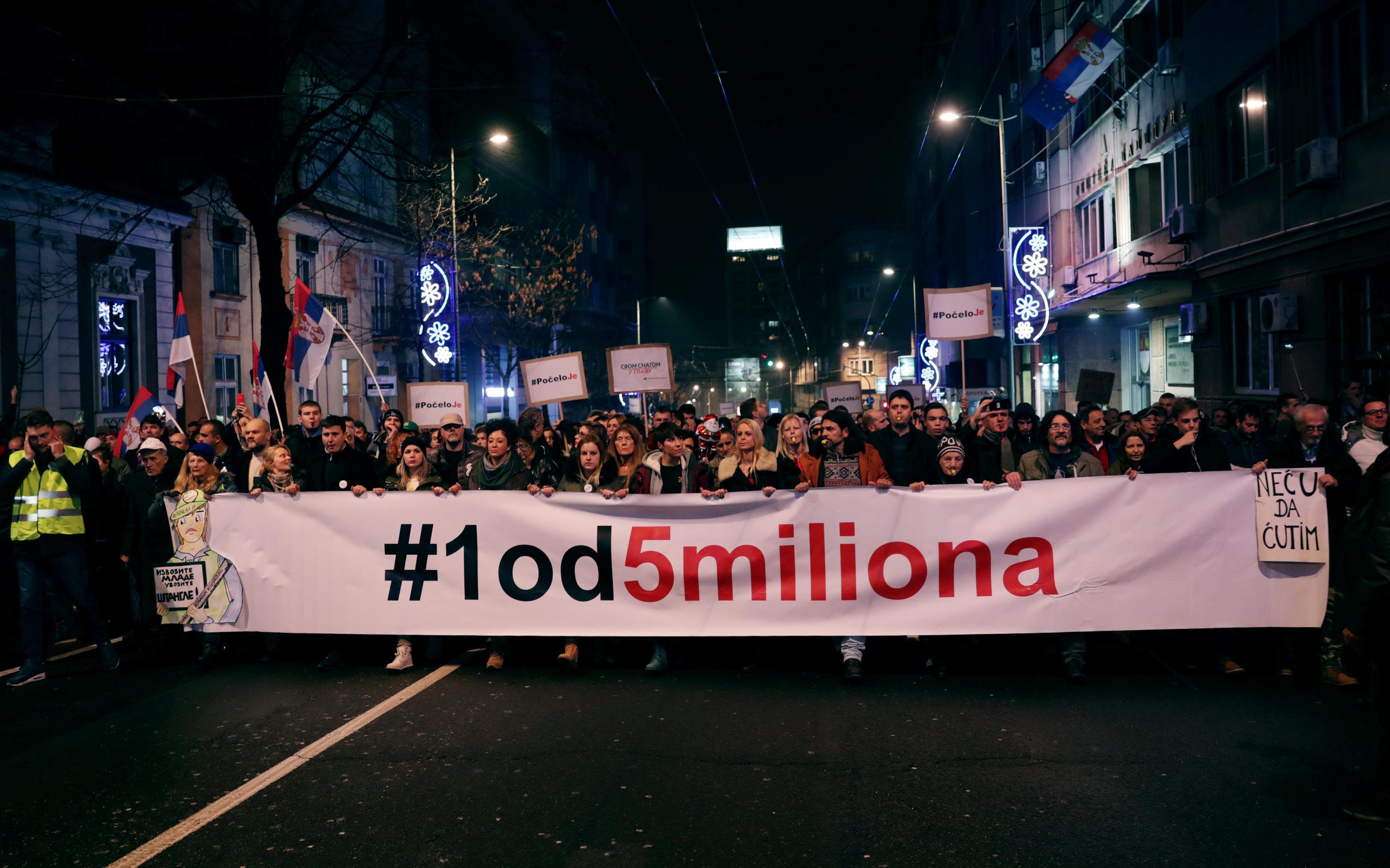 احتشد الآلاف في بلجراد عاصمة صربيا يوم السبت للاحتجاج على سياسات الرئيس ألكسندر فوسيتش وحزبه التقدمي الصربي الحاكم.وهتف الآلاف قائلين ”فوسيتش لص“ أثناء مسيرتهم السلمية في... |