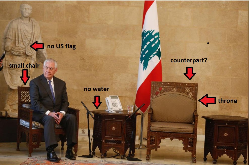 | لا علم، لا ماء، وكرسي ضيق .. وزير خارجية امريكا حزينا في قصر لبنان |