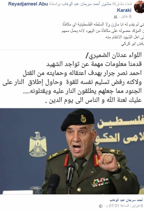 | منشور خطير : اعتراف "السلطة الفلسطينية " بمقتل الشهيد جرار |