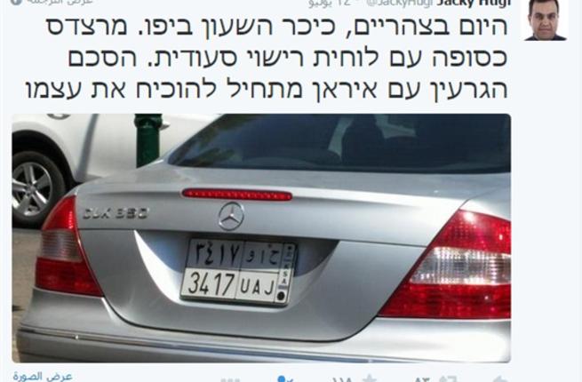 نشر مراسل الشؤون العربية في إذاعة الجيش الإسرائيلي، جاكي حوغي، صورة لسيارة تحمل لوحة ترخيص تابعة للمملكة السعودية، تجوب شوارع مدينة يافا، الملاصقة لمدينة تل أبيب.وذكر حوجي... |