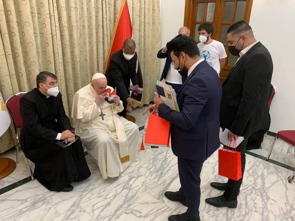 | في لقطة نادرة .. البابا يقبل العلم العراقي |