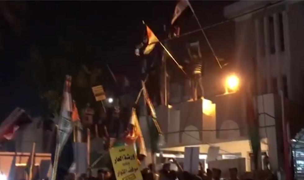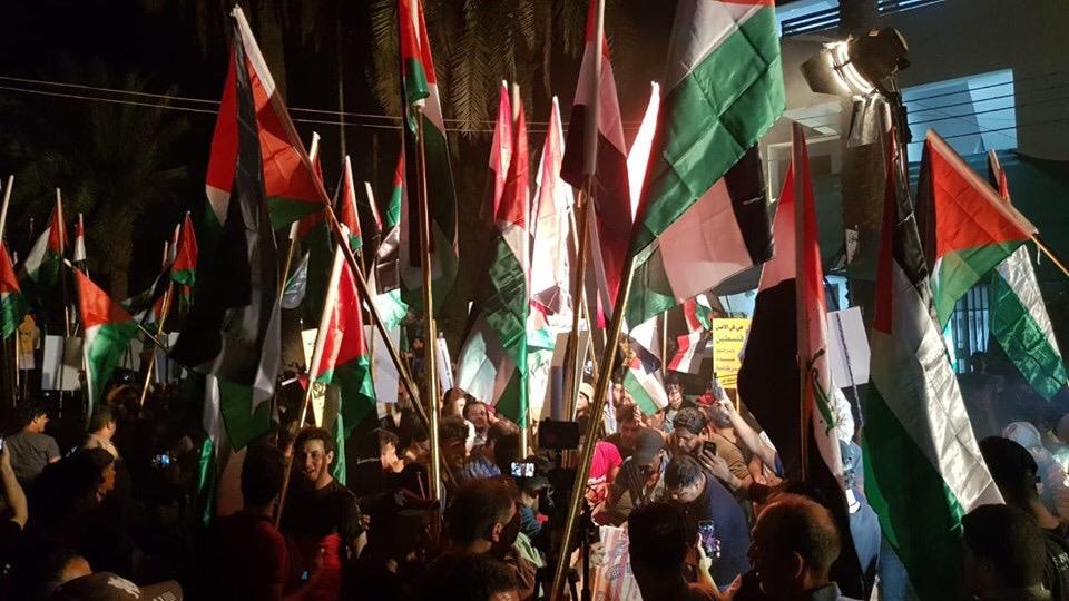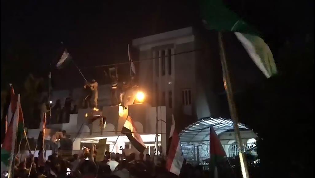 | عراقيون يقتحمون السفارة البحرينية ويرفعون العلم الفلسطيني فوقها |