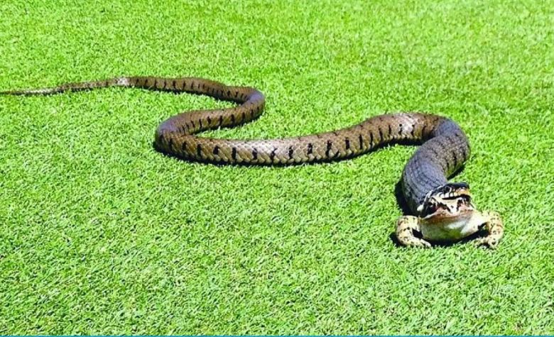 | لاعبو غولف يفاجؤون بثعبان يلتهم حيوان كنغر في الملعب |