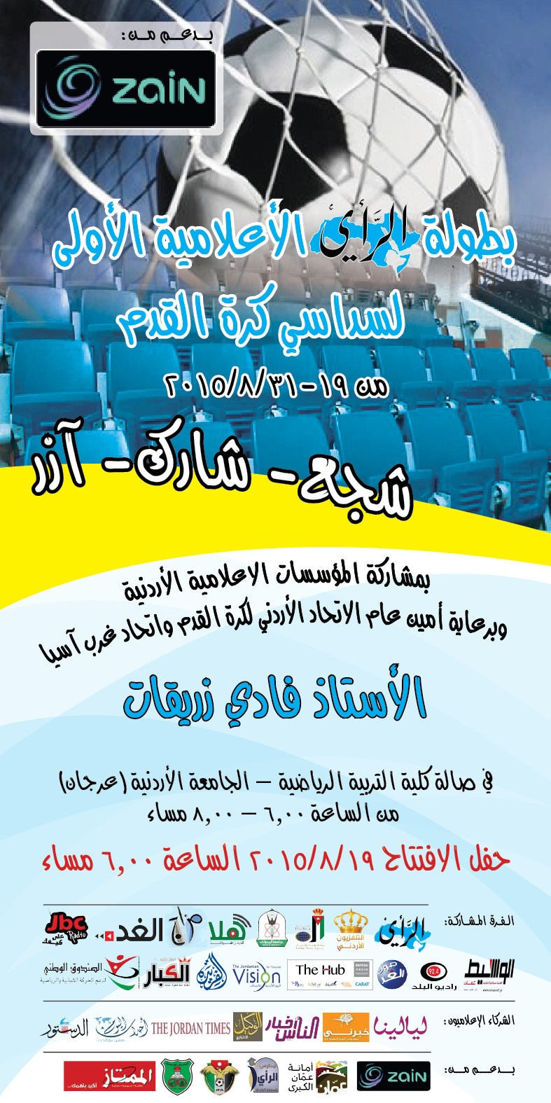 تنطلق عند السابعة مساء اليوم بطولة سداسي الرأي الاعلامية الأولى لكرة القدم بالمواجهة الافتتاحية بين المنظم والتلفزيون الاردني على ملاعب كلية التربية الرياضية في عرجان -... |