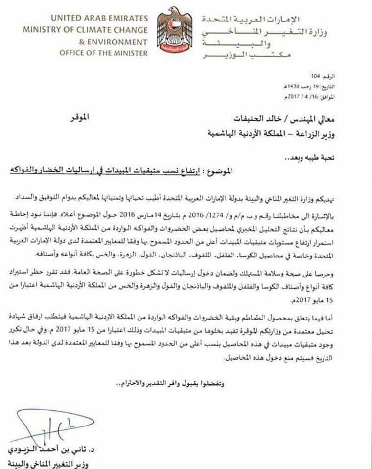خاطبت دولة الامارات العربية المتحدة الحكومة الاردنية في وقت سابق حول نتائج التحليل المخبري للمنتجات الزراعية المستوردة من الاردن تؤكد ارتفاع المبيدات فيها عن الحدود المسموح... |