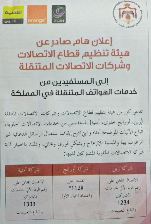 دعت هيئة تنظيم قطاع الاتصالات وشركات الاتصالات المتنقلة ( زين٬اورانج خلوي٬ امنية) المستفيدين من خدمات الاتصالات الخلوية٬ اتباع آليات تتيح ايقاف استقبال الرسائل الدعائية غير... |