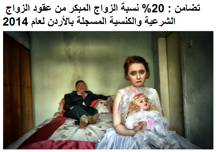 | 20% نسبة الزواج المبكر من عقود الزواج الشرعية والكنسية المسجلة بالأردن لعام 2014 |