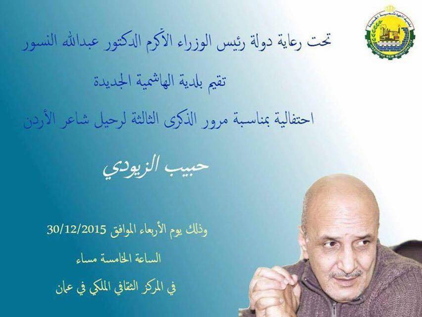 برعاية دولة رئيس الوزراء الدكتور عبدالله النسور تقيم بلدية الهاشمية الجديدة وبلدية بيرين الجديدة احتفالية بمناسبة مرور الذكرى الثالثة لرحيل شاعر الاردن حبيب الزيودي يوم... |