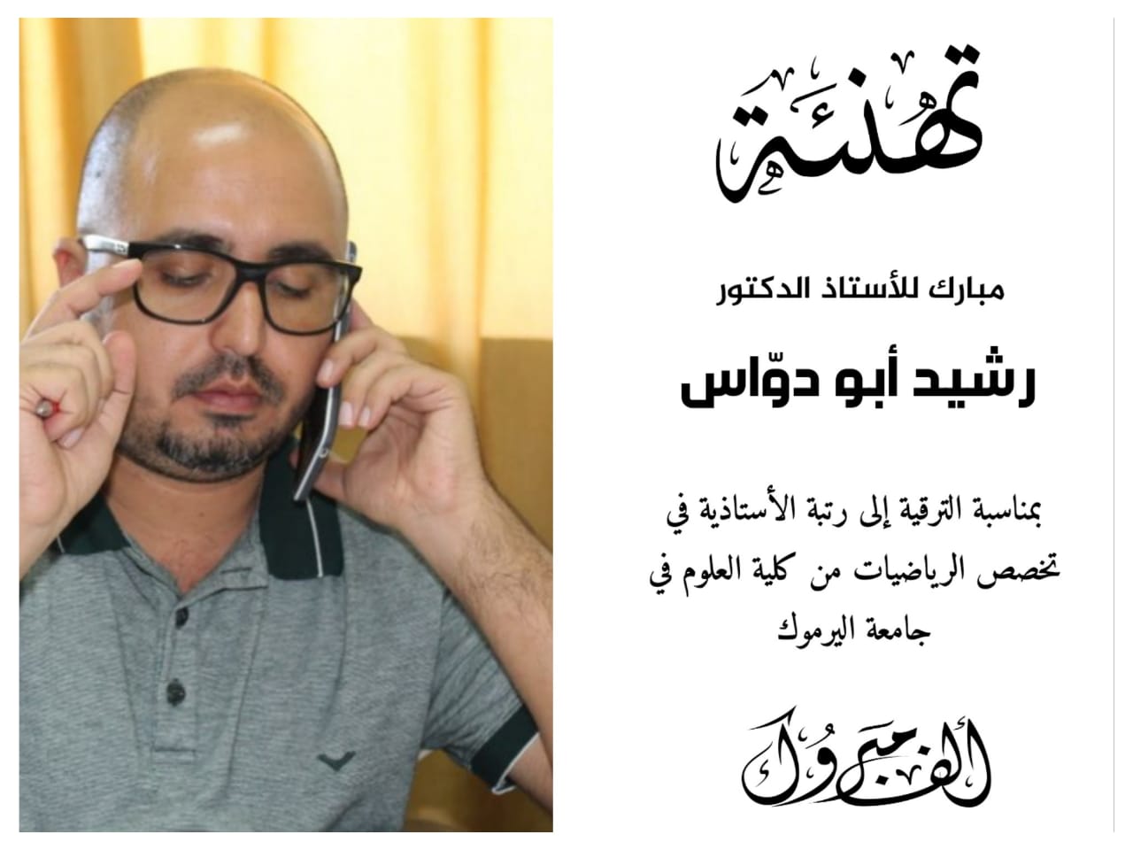 يتقدم الأهل والأصدقاء والزملاء بخالص التهنئة والتبريك للأستاذ الدكتور رشيد رشدي أبو دواس، بمناسبة صدور قرار مجلس عمداء جامعة اليرموك بترقيته إلى رتبة أستاذ في تخصص... |