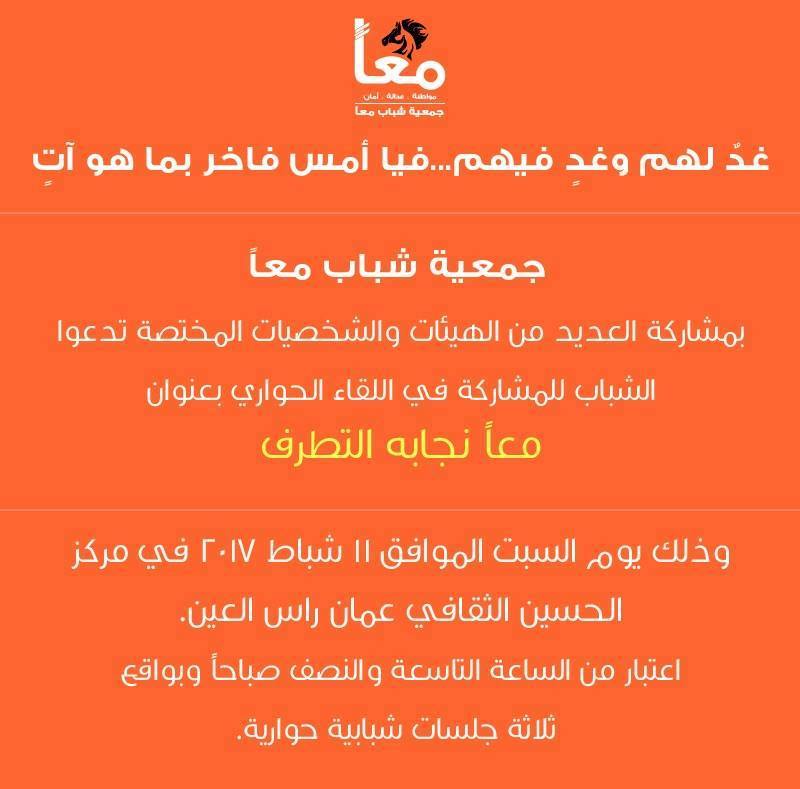 تنظم جمعية شباب معا لقائين حواريين حول التطرف والدولة المدنية السبت المقبل في عمان والزرقاء .وسيعقد صباح السبت المقبل في عمان لقاء حواري بعنوان معاً نجابه التطرف في مركز... |